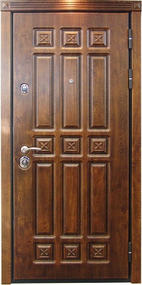 В более простой комплектации дверная коробка сделана из полой профильной трубы прямоугольного сечения, укрепленной металлической полосой по всему периметру. Полотно двери также выполнено из профильной трубы, полость заполнена деревянным брусом и укреплена ребрами жесткости. Снаружи оно покрыто металлическим листом толщиной 2 мм, изнутри листовым оргалитом . Толщина дверного полотна в торце 5 см.